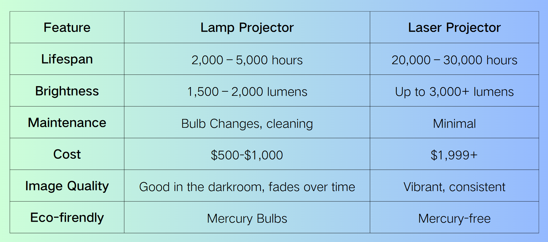 激光投影仪几乎无需维护,无需像灯泡投影仪那样频繁更换昂贵的灯泡。虽然灯泡机型的初始价格更低(起价约 $500-$1,000),但激光投影仪(通常为 $2,000 或以上)凭借更长的使用寿命和极低的维护需求,为经常使用的用户带来长期节省,让您尽享娱乐体验。同时,灯泡投影仪中的汞灯泡需妥善处理,以避免对环境造成危害。